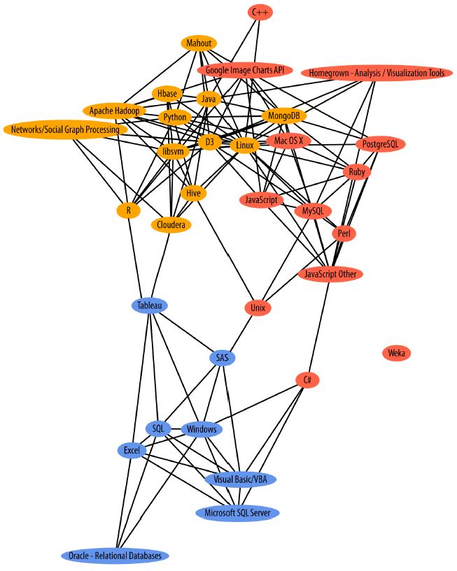 The most striking thing in this graph is the separation between open source tools at the top of the graph and commercial tools at the bottom; respondents tend to use one or the other, but not both. The dense network among open source tools indicates that those who use any open source tool tend to use many others. (Weka’s isolation from other tools in the graph indicates either that (a) Weka is a really awesome tool or (b) Weka users have a unique perspective on life. Or both.)